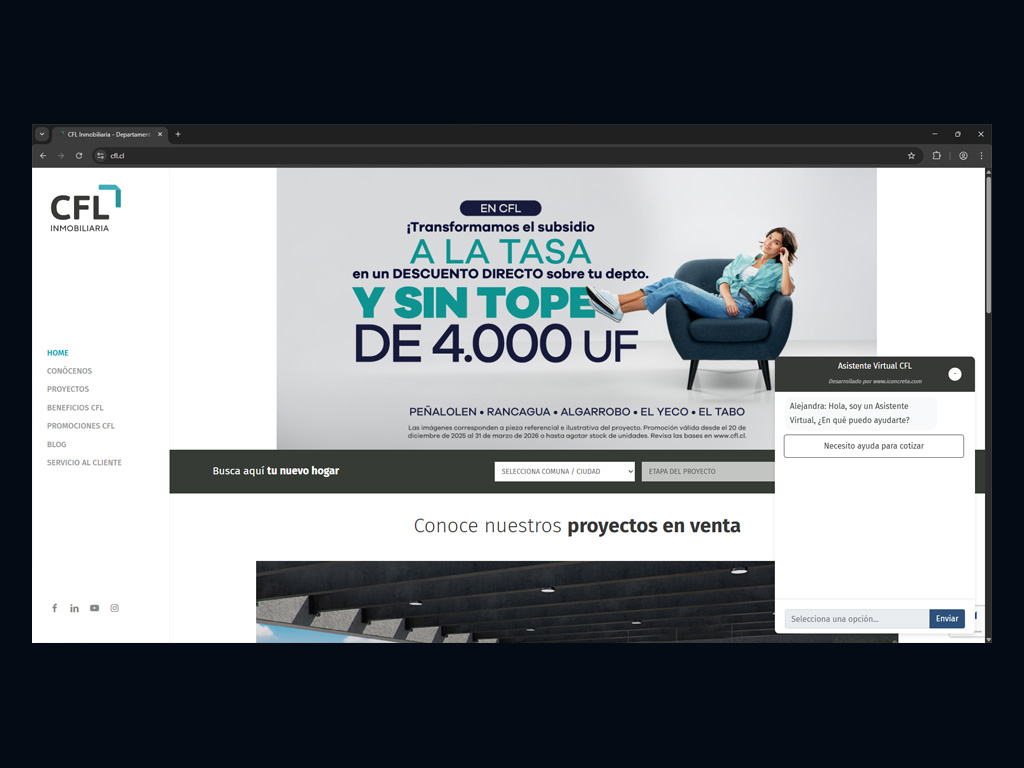 Este es producto diseñado específicamente para su implementación en el sector inmobiliario. Aprovechando la inteligencia de ChatGPT, el chatbot es capaz de validar los inputs de los usuarios de manera eficiente. Su principal objetivo es facilitar a los usuarios la cotización de propiedades, y al finalizar el flujo de conversación, toda la información recopilada se procesa y se integra directamente en el CRM de Iconcreta, Microsoft Dynamics 365.